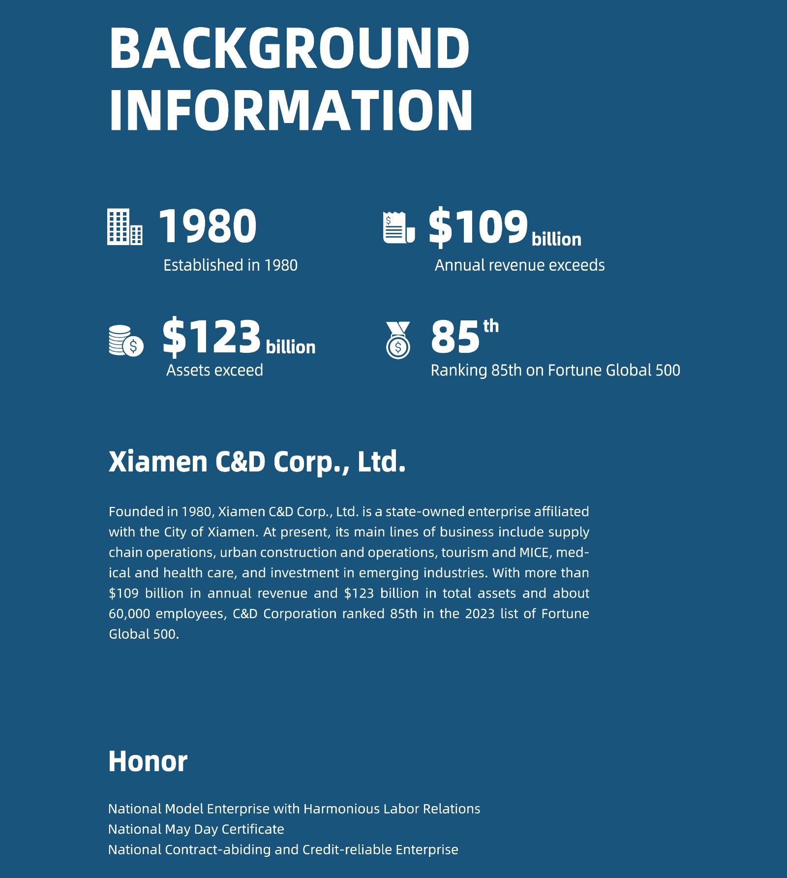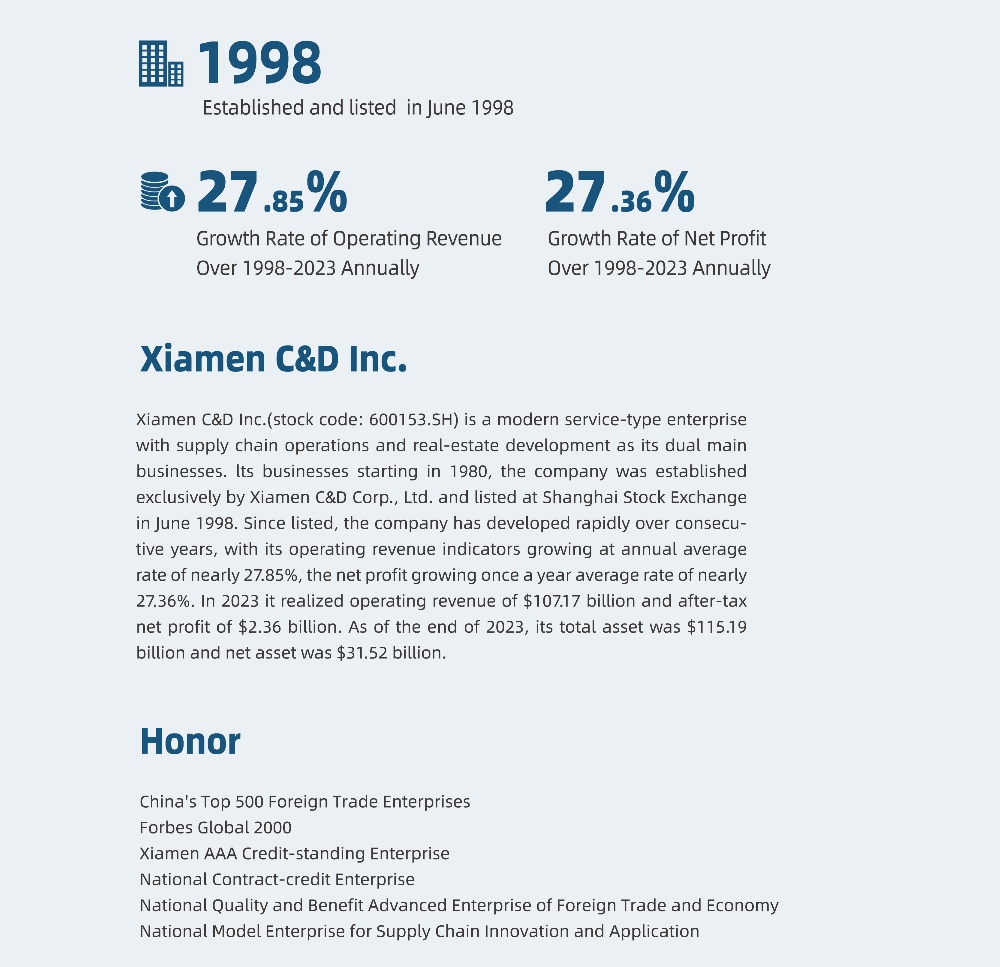Since the establishment, we have strictly implement the“Specialization, Go Global” strategy of our parent company, Xiamen C&D Inc., not only to seize the historical opportunity of China's rapid economic growth, but also gradually clarified its business orientation, and keep up with the pace of national industrial development. We have focused on the steel and raw products supply chain upstream and downstream business, and has build-up business relations with more than 130 countries and regions.