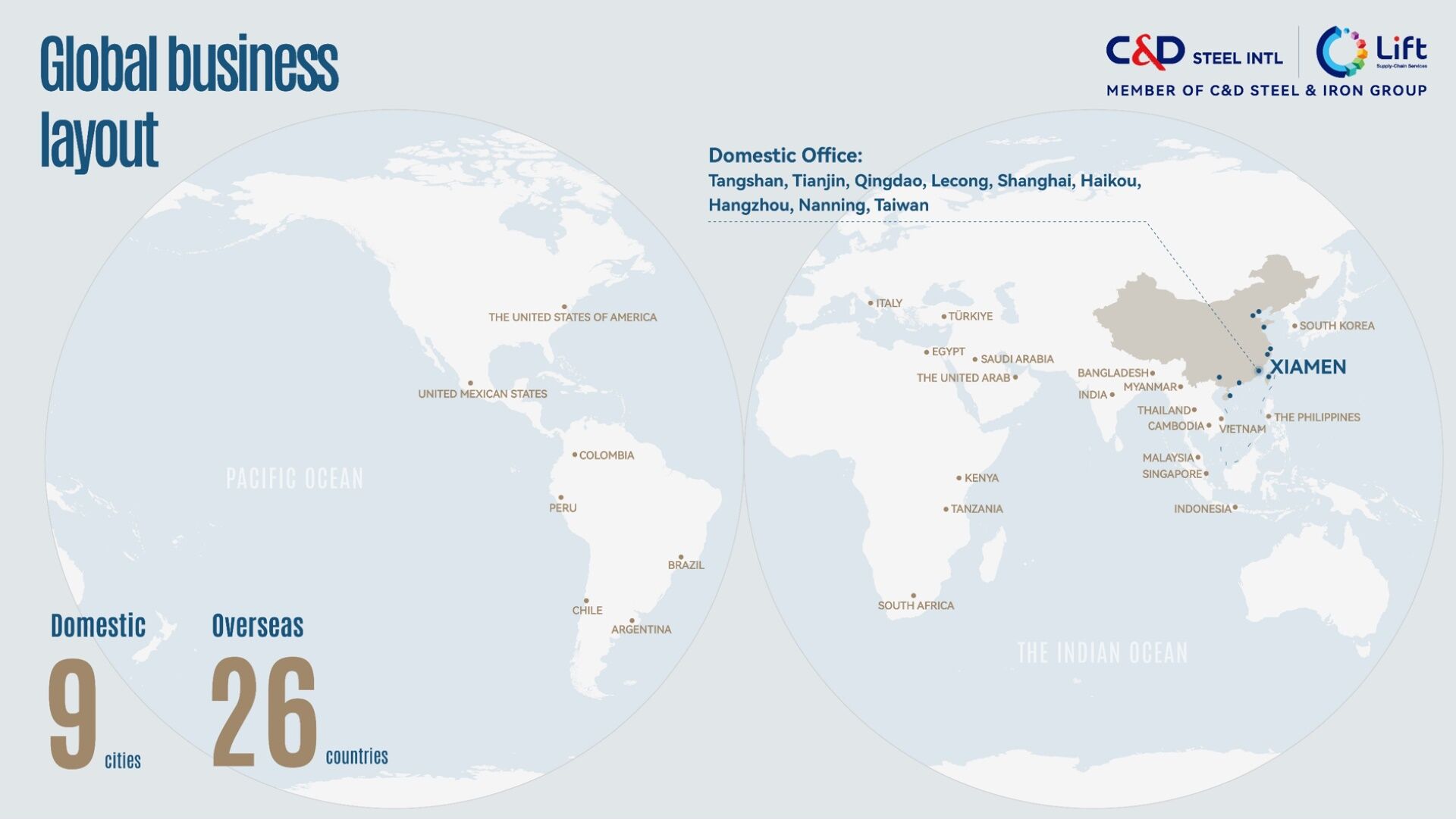 - Domestic Offices: Xiamen, Tangshan, Tianjin, Qingdao, Shanghai, Haikou, and more (total 9 cities).